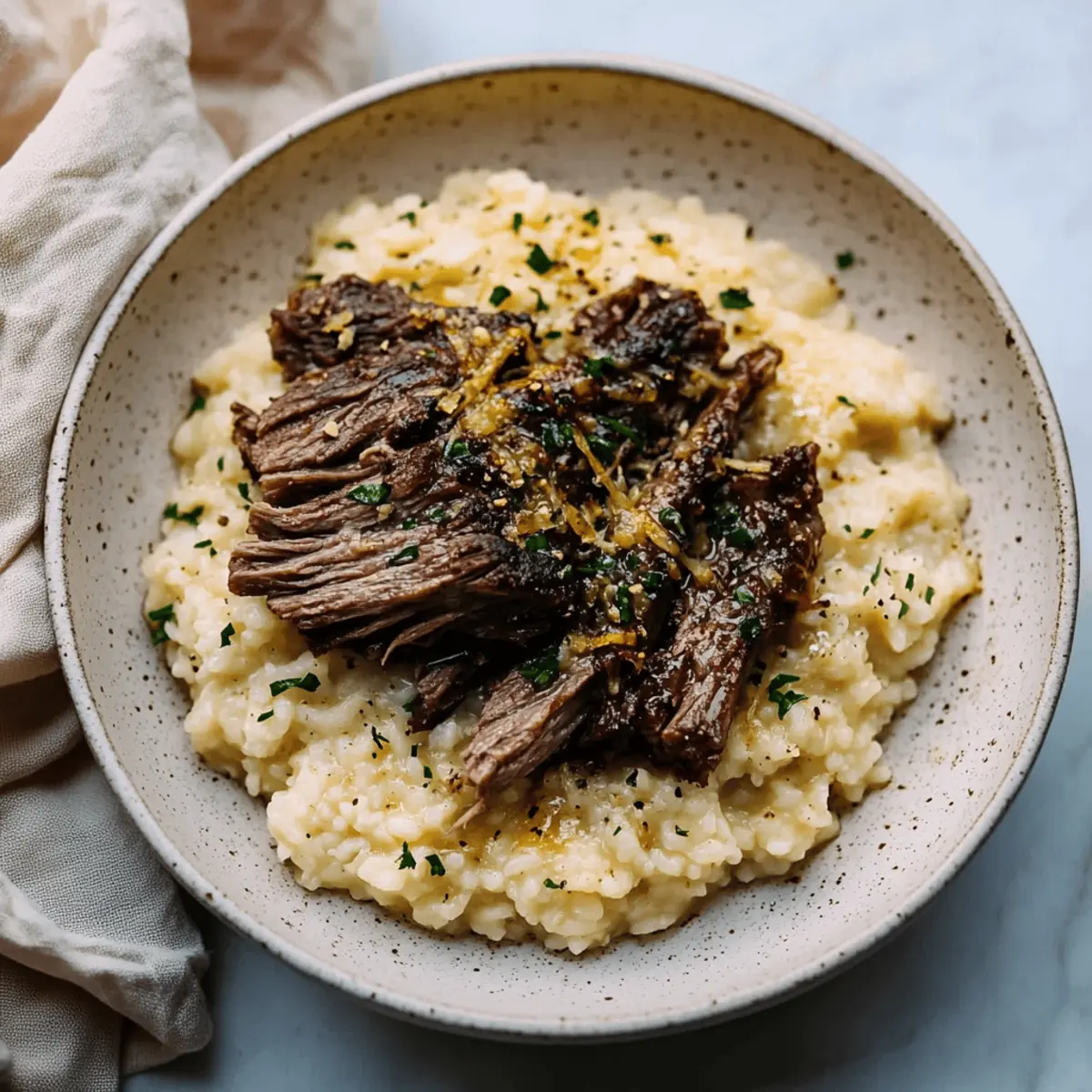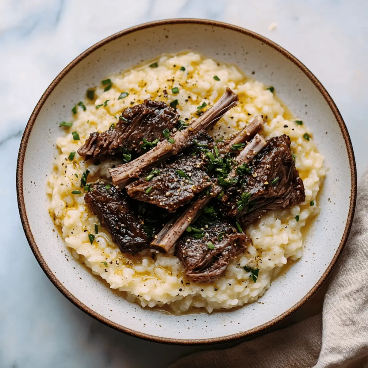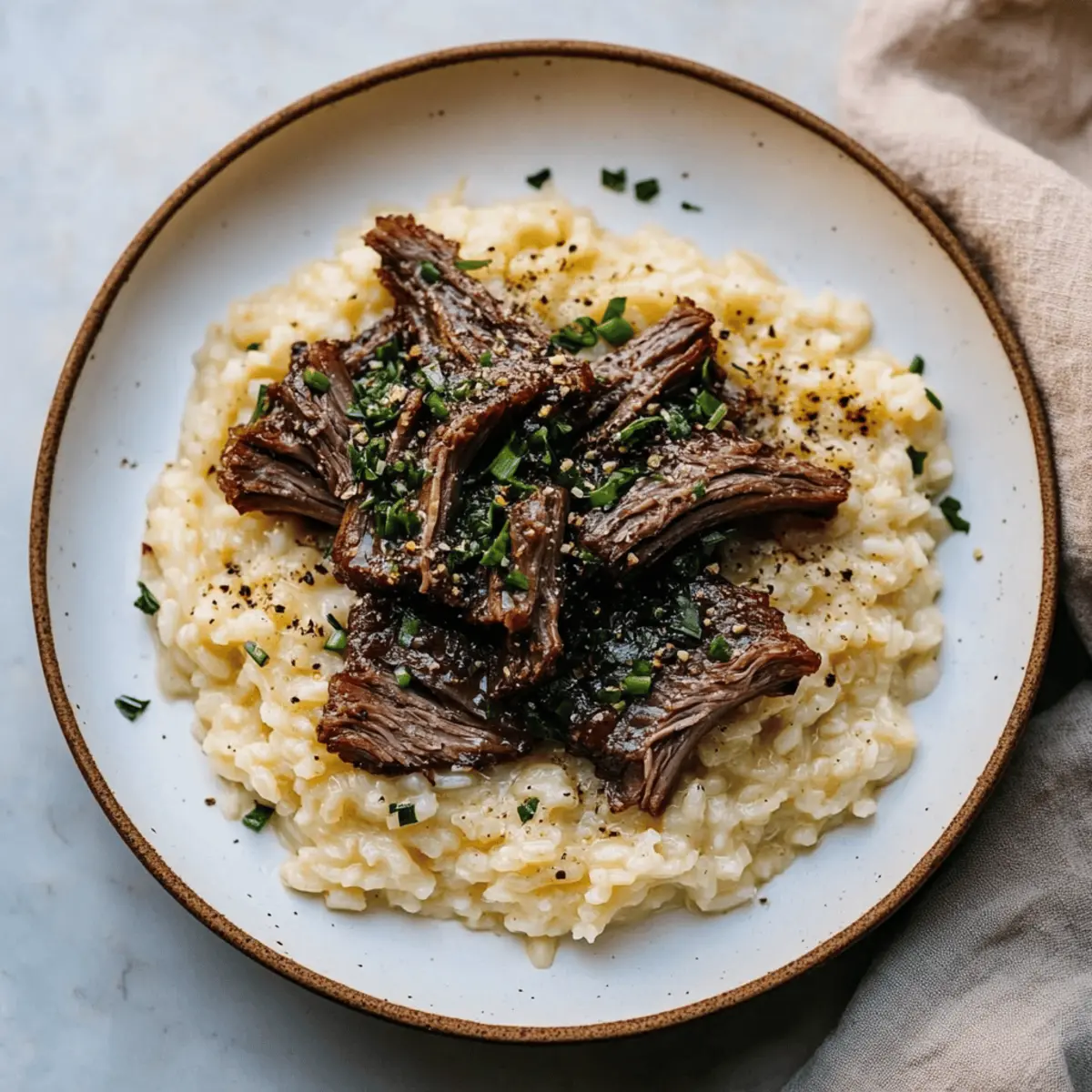 - Spoon a generous portion of the creamy risotto onto each plate. Top it with the tender short ribs and drizzle some of the braising liquid over.