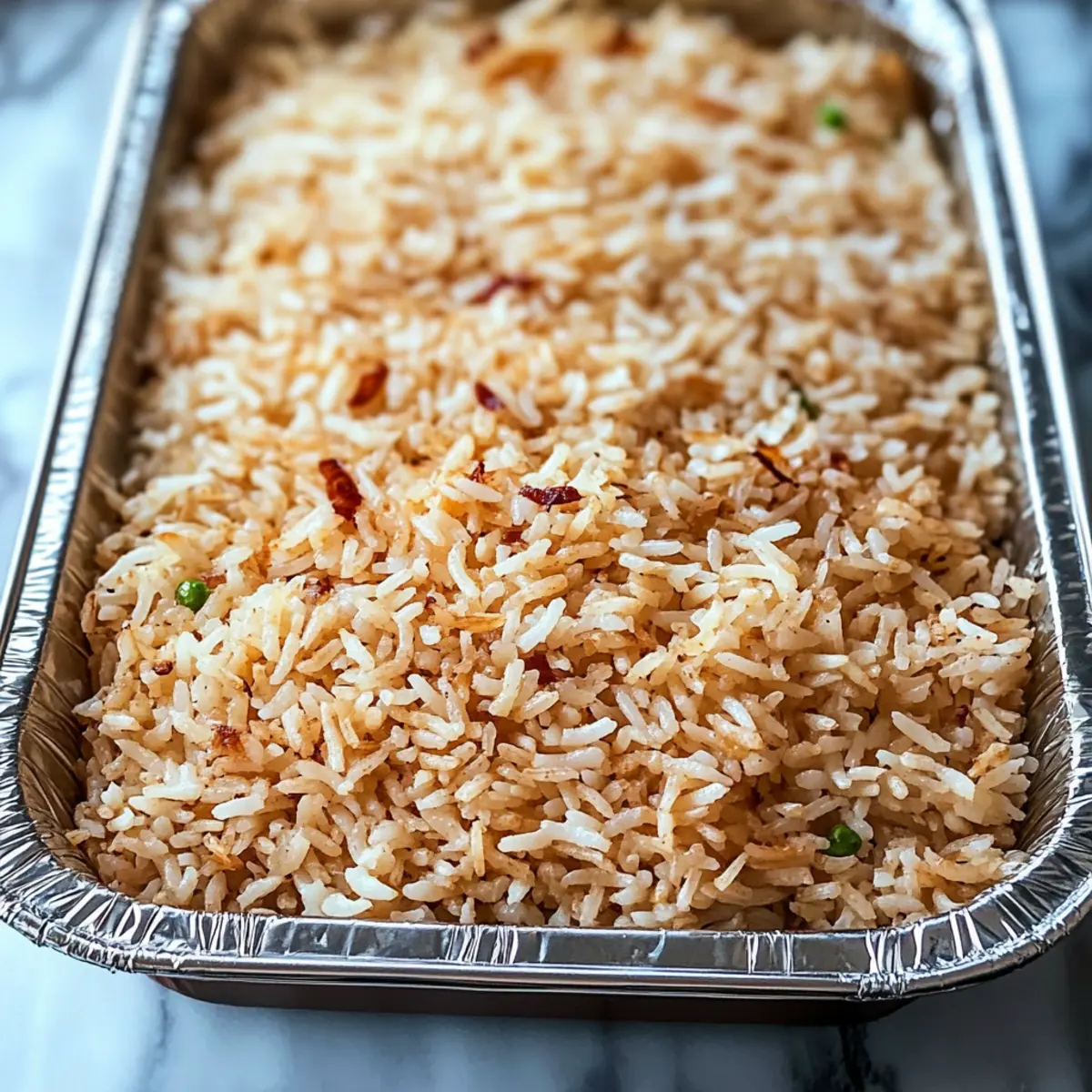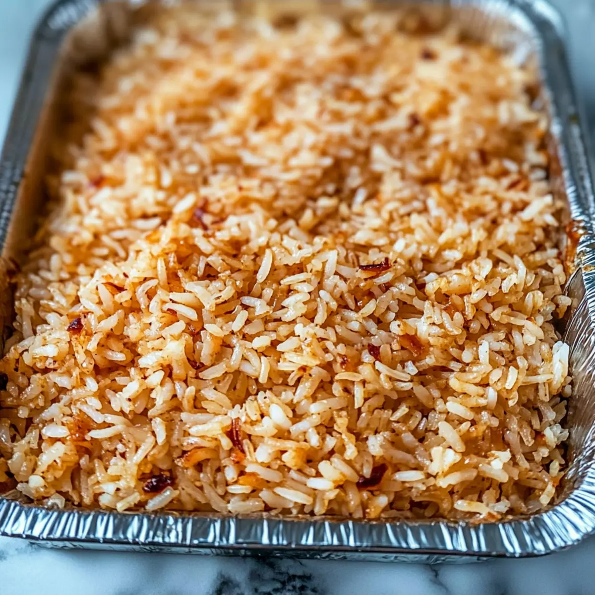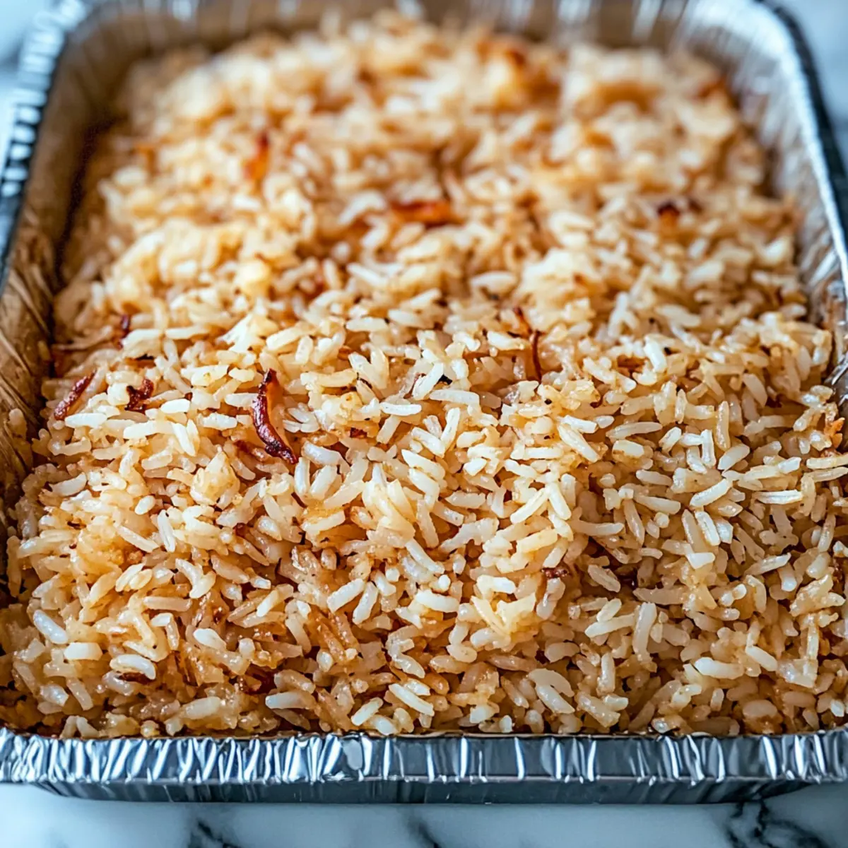 Cover the baking dish tightly with aluminum foil, ensuring that no steam escapes. Place it in the preheated oven and bake for 30 minutes. This process allows the rice to absorb all the flavors while cooking gently, resulting in a beautifully fluffy texture.
