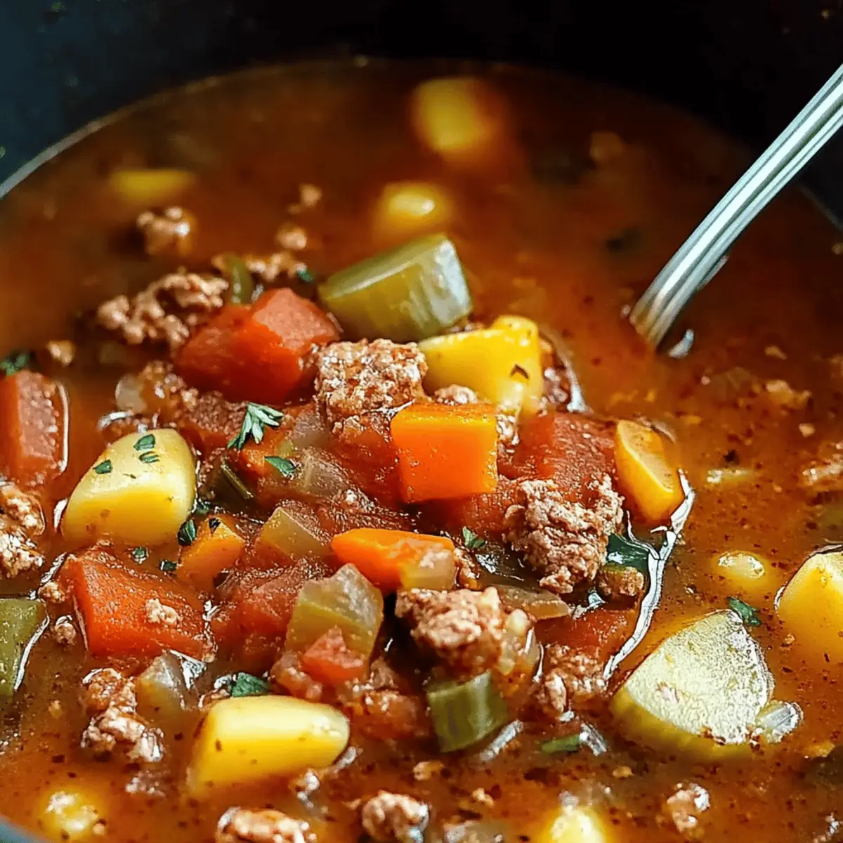 Next, add 1 pound of ground beef to the pot, breaking it apart as it cooks. Stir occasionally for about 5-7 minutes until the meat is browned and no longer pink. Ensure to drain any excess fat if necessary, keeping your soup hearty yet balanced.