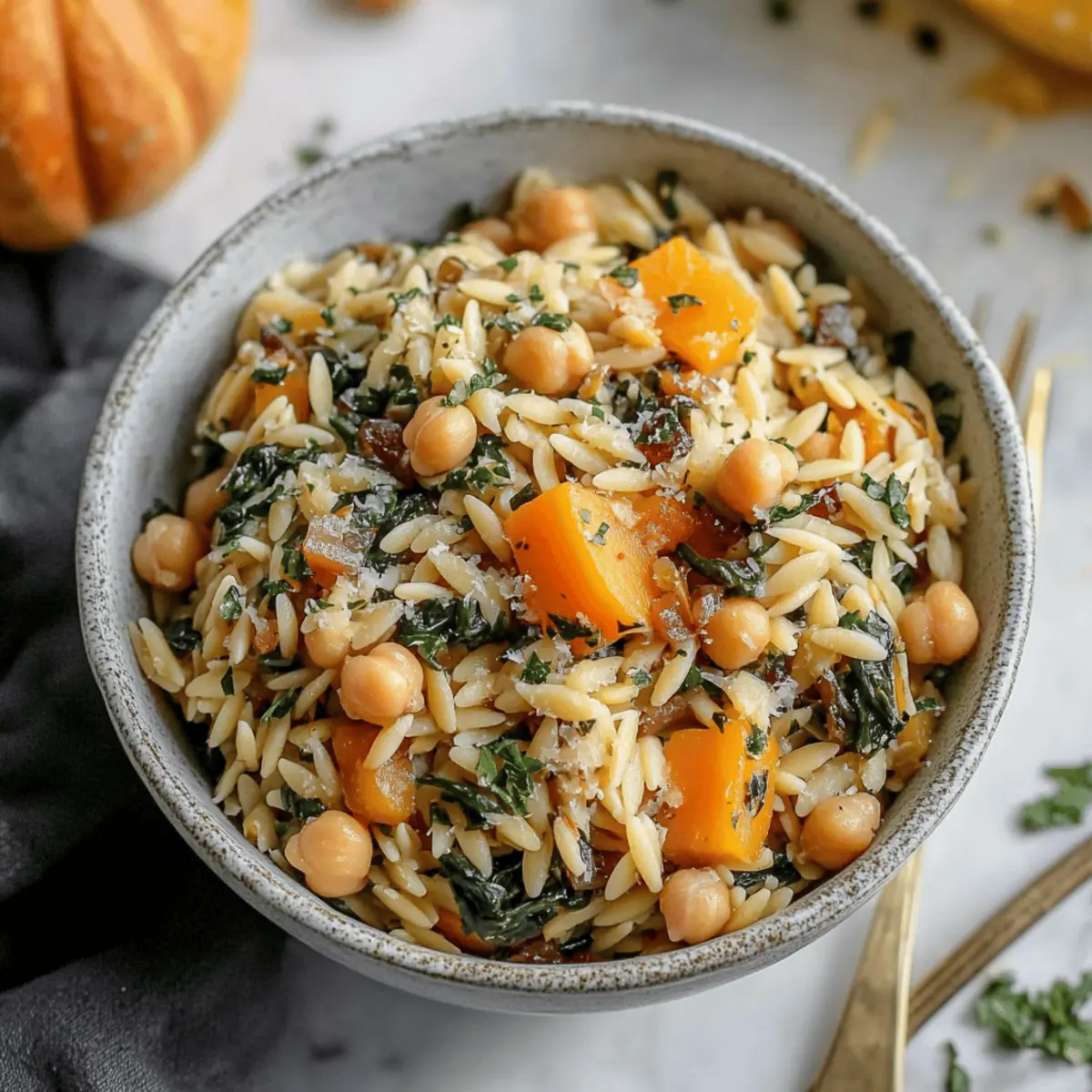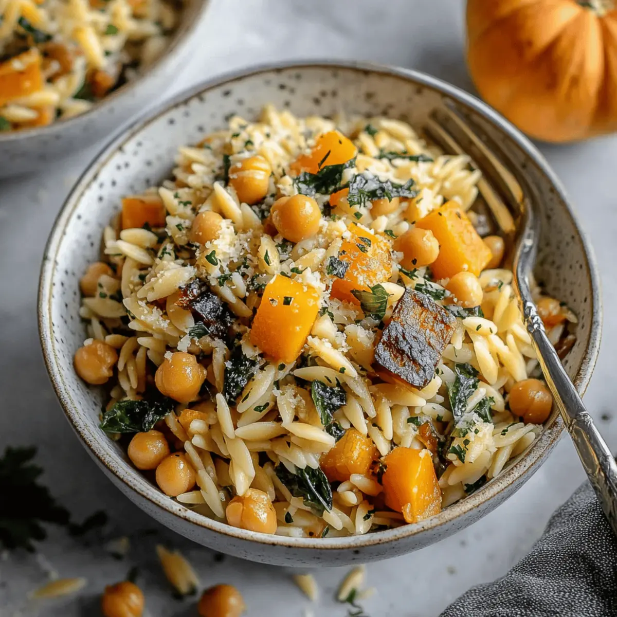 These One Pot Fall Vegetable Orzo and Chickpeas are perfect for busy weeknights when you need a nourishing meal prepped in advance! You can chop the sweet onion, garlic, butternut squash, and mushrooms up to 24 hours ahead—just be sure to refrigerate them in an airtight container to keep them fresh. For the best texture, prepare the complete dish and let it cool, then store leftovers in the fridge for up to 3 days. When it’s time to serve, simply reheat the orzo mixture in a skillet, adding a splash of vegetable stock to maintain the creamy consistency. This way, your comforting autumn meal will be just as delicious, and you’ll save precious time!