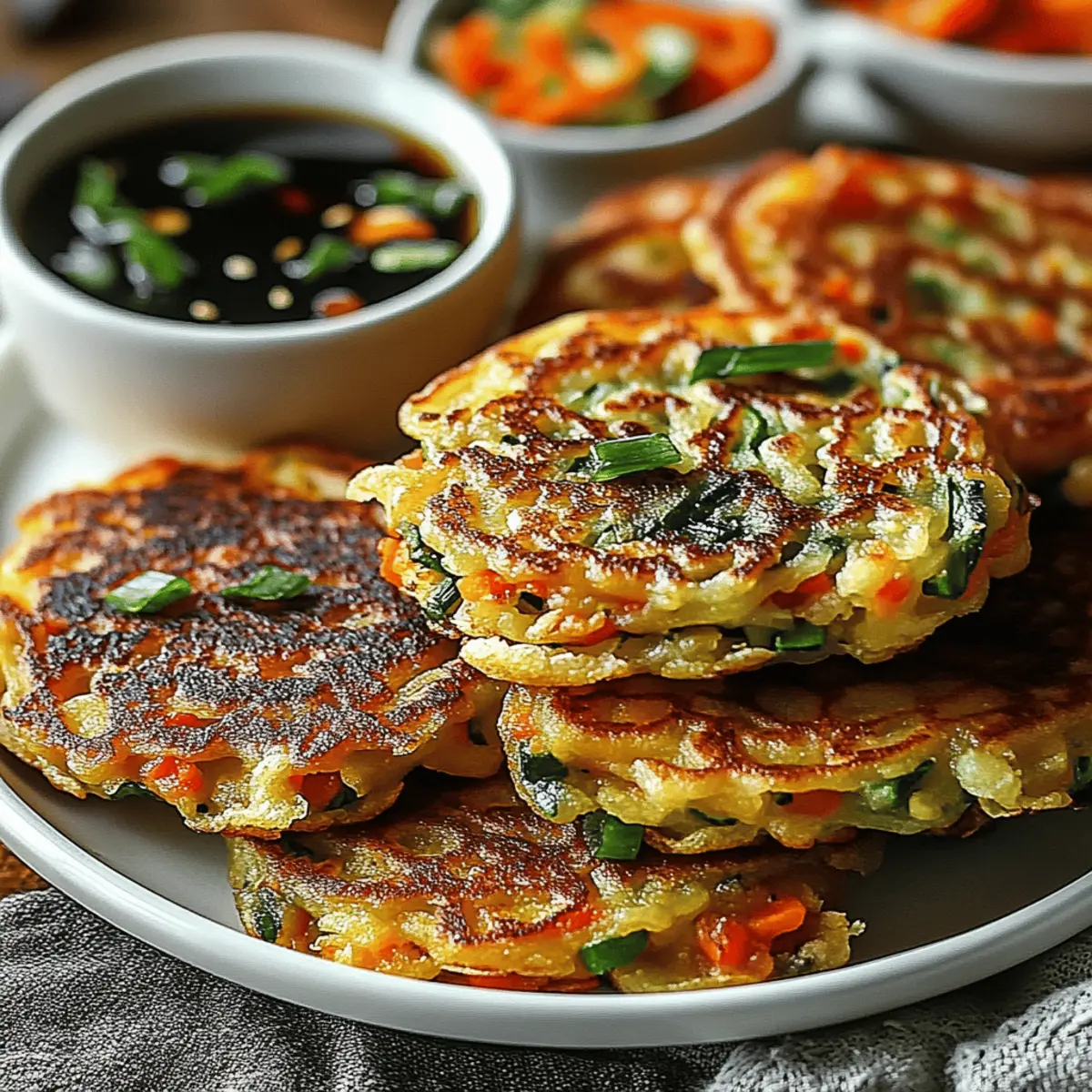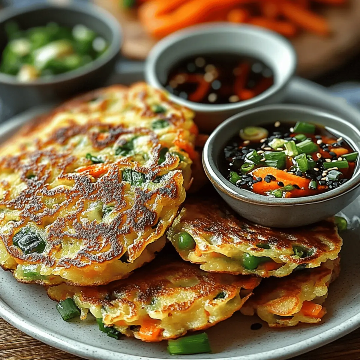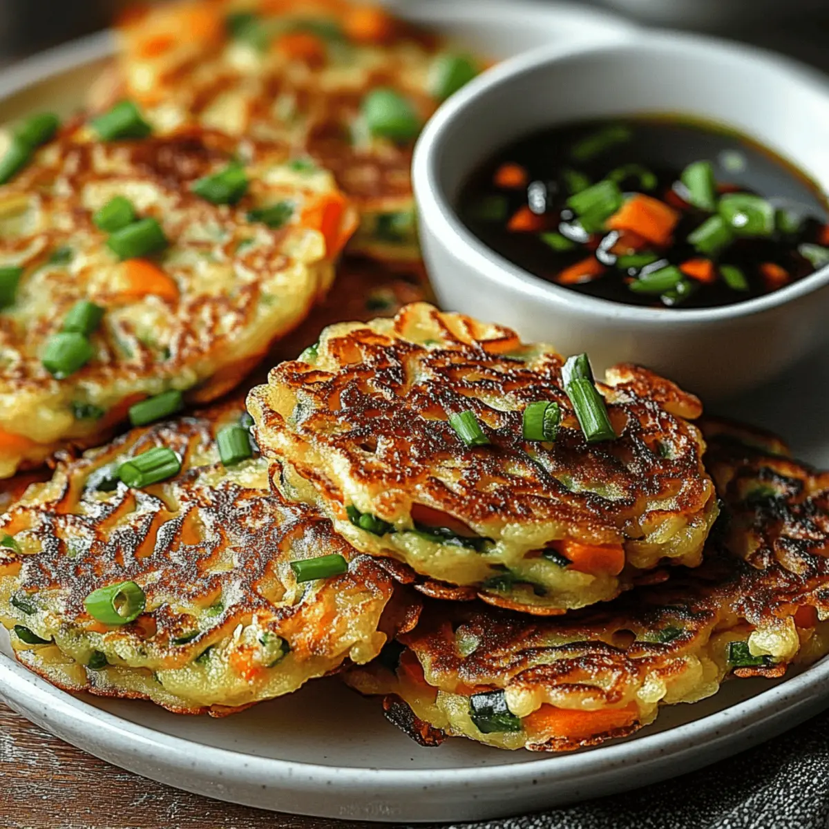 Serve the crispy vegetable pancakes warm alongside the dipping sauce for easy dipping. For an elegant touch, garnish the pancakes with sesame seeds and extra chopped green onions. This delightful presentation elevates the dish, making your meal not only delicious but visually appealing too!