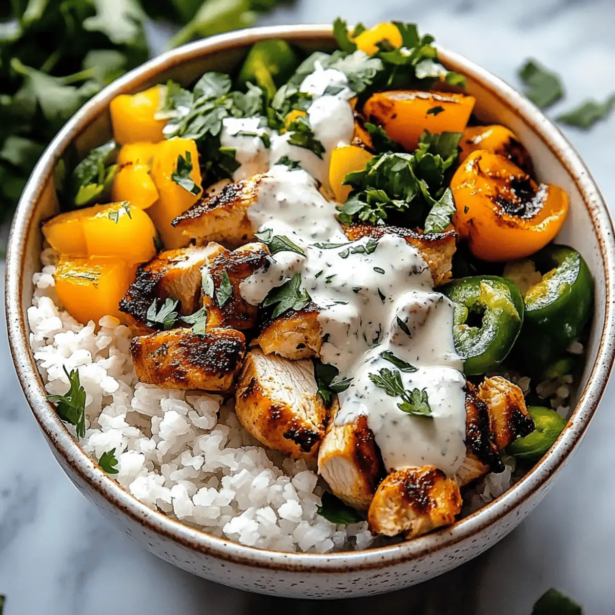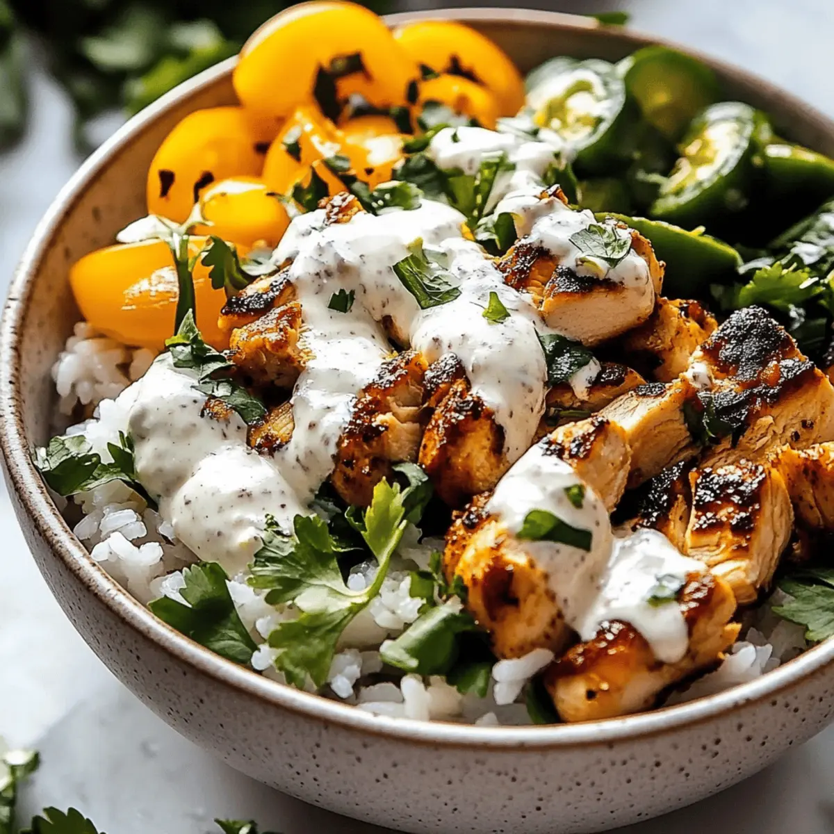 - Assemble the bowls with a base of rice or quinoa, topped with chicken, sautéed kale, and a generous drizzle of tahini feta sauce.