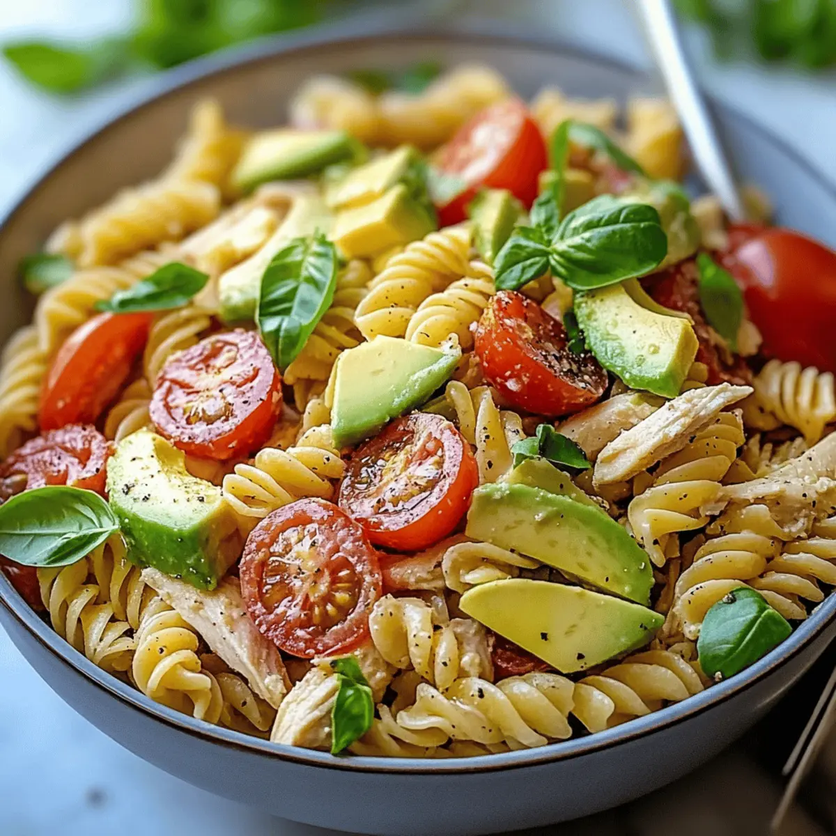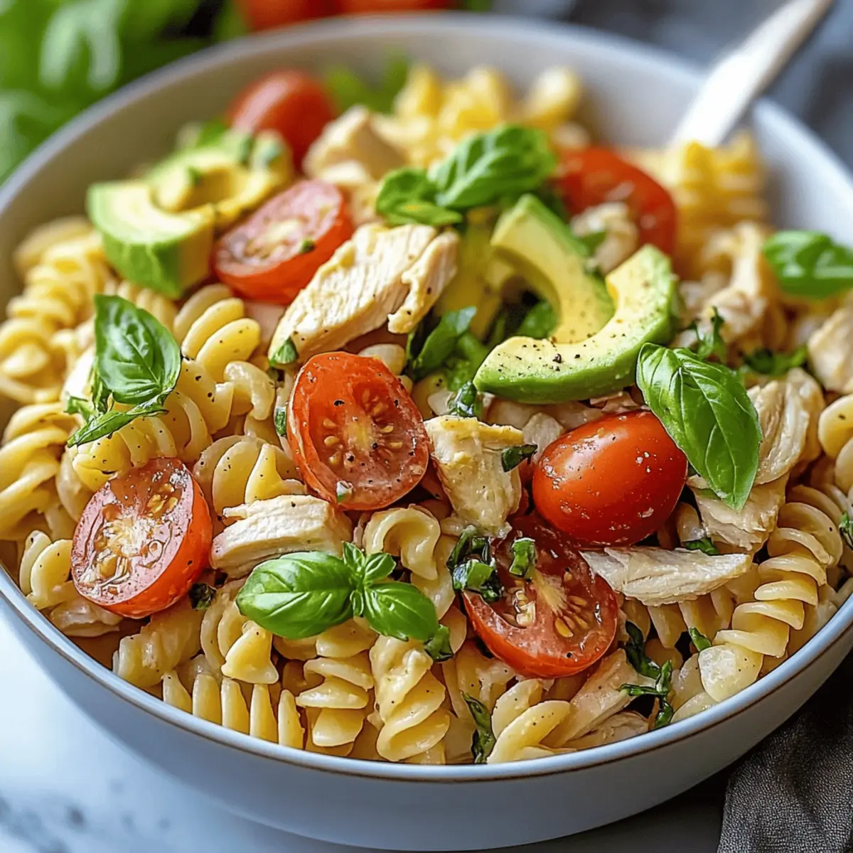 Preparing your Healthy Chicken Pasta Salad with Avocado and Tomato in advance is a wonderful way to save time on busy weeknights! You can cook the rotini pasta and shred the chicken up to 3 days ahead, allowing flavors to meld beautifully while stored in the refrigerator. Chop the red onion and wash the cherry tomatoes, as these components hold their quality well when prepped in advance. When you're ready to serve, simply dice the avocado and combine all ingredients in a large bowl, drizzling your homemade dressing over the top. This way, you’ll have a fresh, vibrant salad just as delicious as when you made it from scratch!