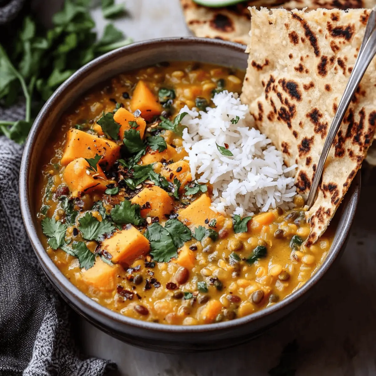 Hearty Coconut Sweet Potato Lentil Soup with Rice Delight