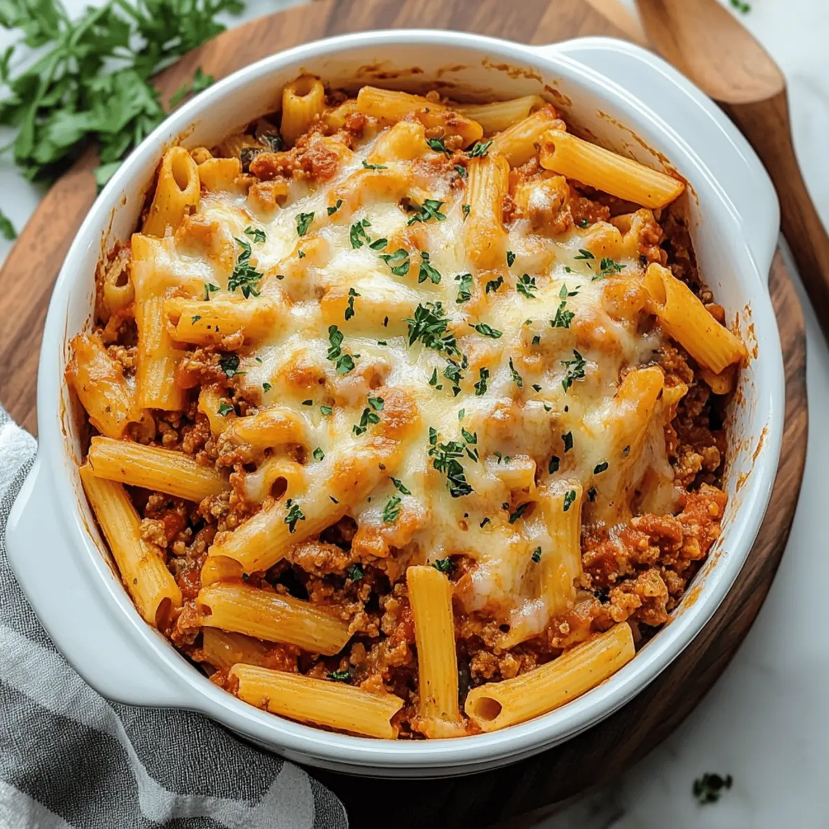 Start by heating a skillet over medium-high heat. Add the ground beef and chopped onion, stirring occasionally for about 5 minutes until the meat is well-browned and the onion is translucent. Incorporate minced garlic, dried basil, and parsley into the mixture, cooking for an additional minute until fragrant. This step builds a flavorful foundation for your Slow Cooker Baked Ziti.