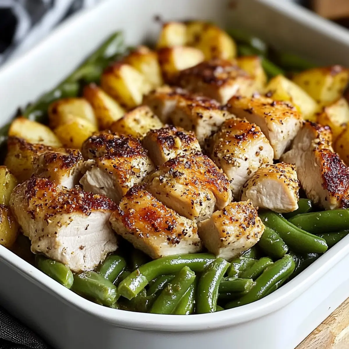 Dice Yukon Gold potatoes into bite-sized pieces, aiming for uniformity to ensure even cooking. Next, trim the green beans into 1-inch sections. Once prepared, layer the potatoes and green beans in your baking dish, creating a vibrant bed of vegetables that will complement the chicken perfectly.