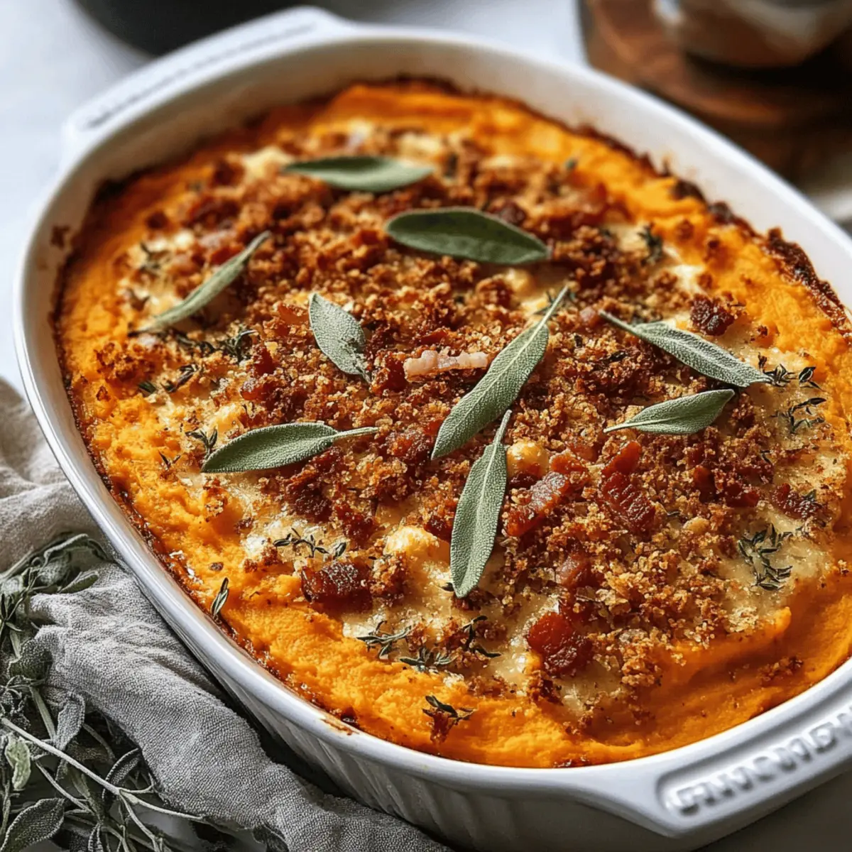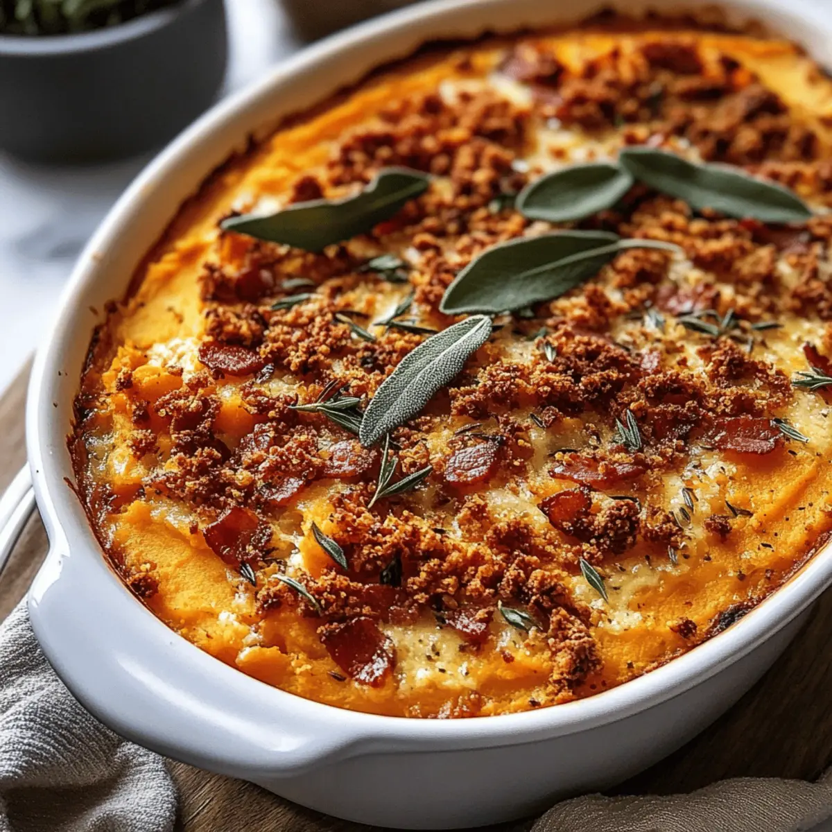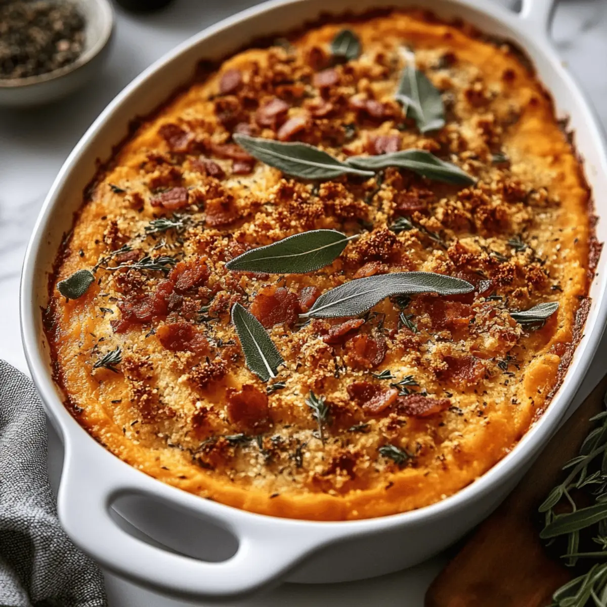 Indulgent Savoury Sweet Potato Casserole with Crispy Sage and Bacon